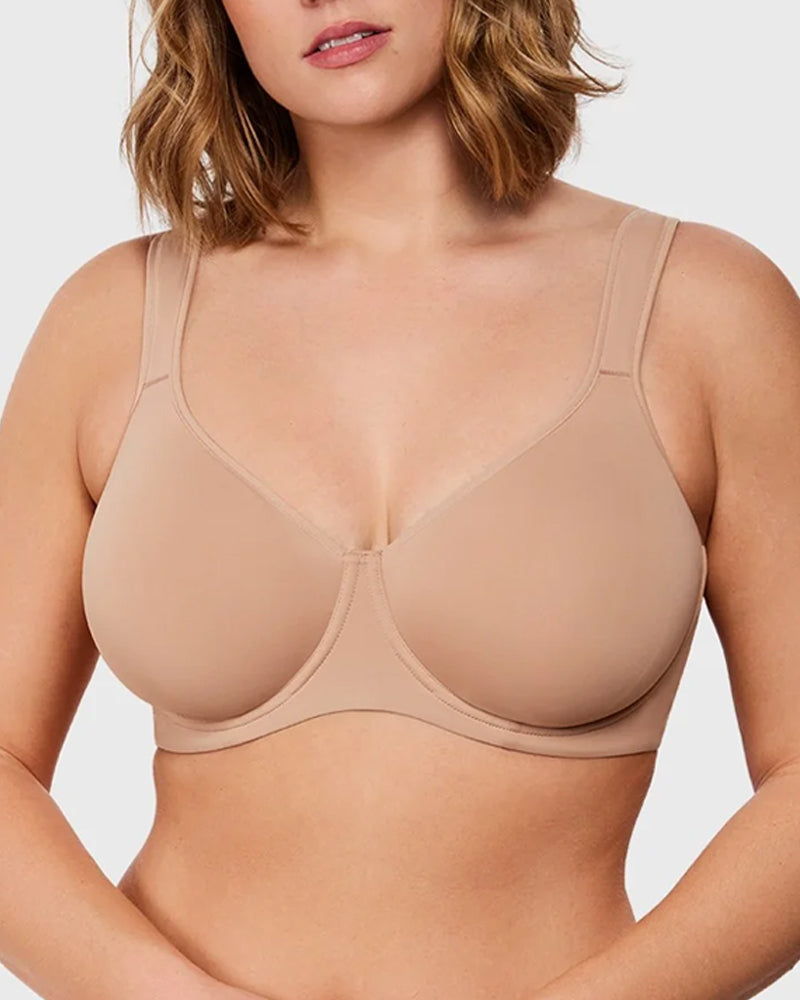 ·Wider Cushioned Shoulder Strap: Wide, cushioned straps adjust to your fit with hook and eye closures; this full coverage bra is lightly lined and seamless with underwire cups that minimize, creating a natural shape and lift with worry-free support ·U-Shaped Smoothing Back: U-shaped power back helps to take the weight off your shoulders for the ultimate comfort fit. The inner stitching design keeps the underside of the bra from hurting against your ribs.